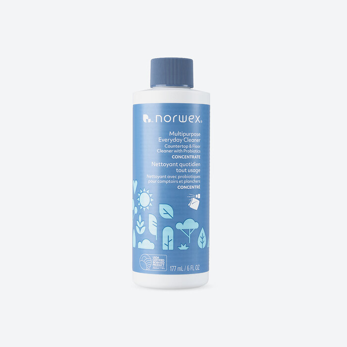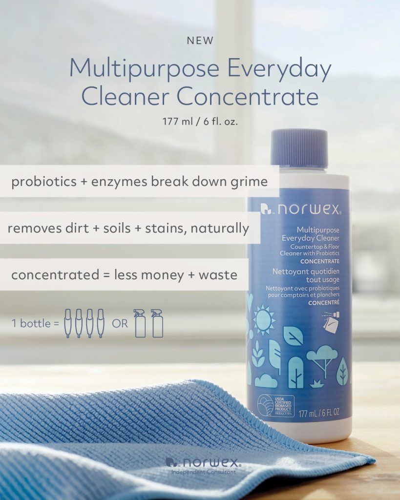 When you use your home for everyday living, it can start to show! The reality of kids and pets, hobbies, and regular meals can leave behind messes, putting your space in need of a little more TLC. Instead of reaching for a chemical cleaner, Norwex has a new solution- the Multipurpose Everyday Cleaner Concentrate! With just probiotics that create enzymes and plant-based surfactants these messes are quickly broken down so they can be wiped away without scrubbing. It is safe on multiple hard surfaces like wood, tile, marble, granite, grout, glass and stainless steel. It comes as a concentrate so each bottle contains at least 2 spray bottles worth.